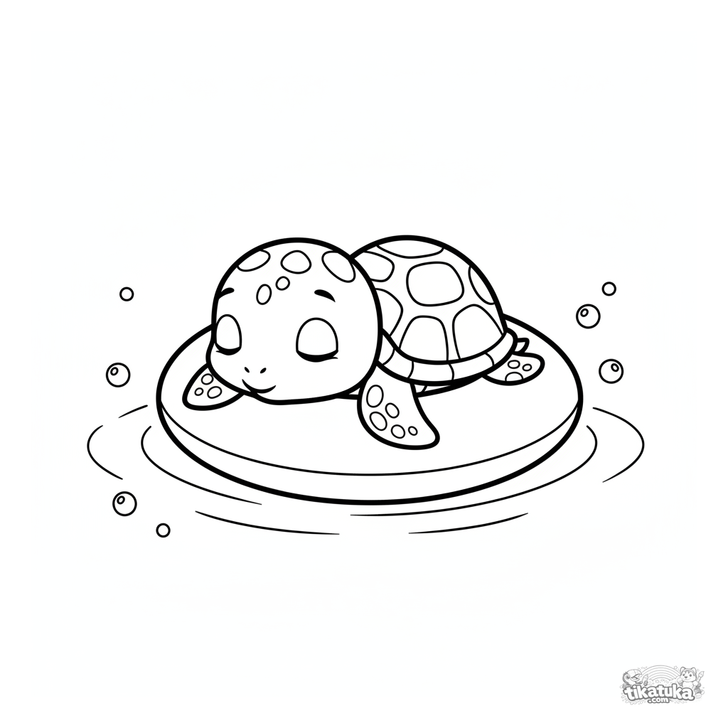Einfaches Ausmalbild für Kleinkinder: Babyschildkröte schläft in einem Schwimmring im Pool. Große Formen, wenige Details. Für Kinder von 2-3 Jahren.