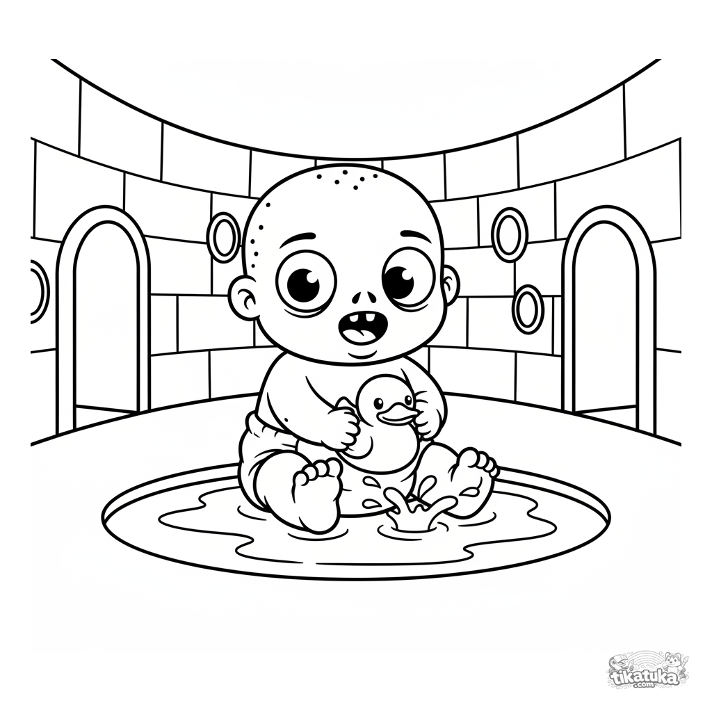 Einfaches Ausmalbild für Kleinkinder: ein Baby-Zombie spielt mit einer Quietscheente in einer Kanalpfütze. Große Formen.