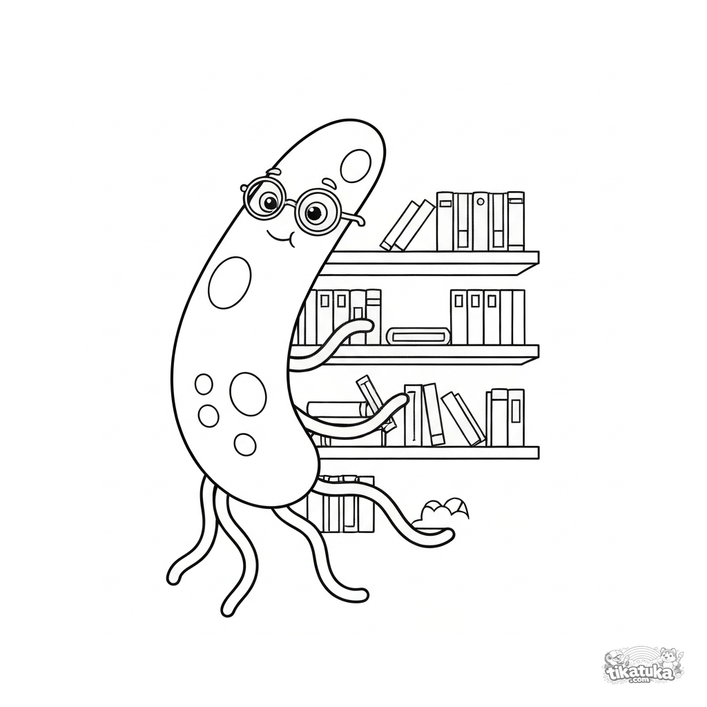 Ausmalbild für Kinder. Niedliches Bibliothekar-Bakterium mit Brille und Tentakeln ordnet Bücher im Regal. Cartoon-Stil. Kostenlos herunterladen.