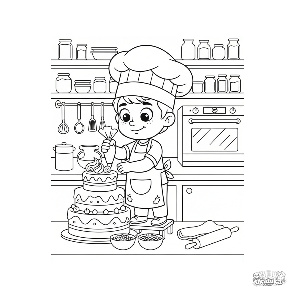Ausmalbild eines Bäckerjungen, der eine Etagentorte in einer Bäckerei verziert. Für Kinder von 4-6 Jahren.