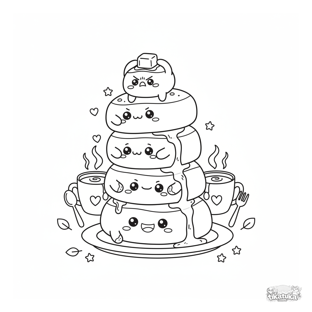 Ausmalbild eines balancierenden Pfannkuchenstapels. Süße Pfannkuchen halten ein Stück Butter. Für Kinder von 4-6 Jahren.