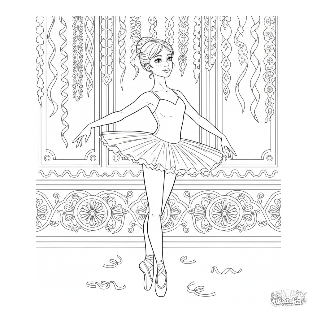 Detailliertes Ausmalbild für Kinder von 10-12 Jahren: Eine Ballerina in Arabesque-Pose übt in einem dekorierten Festsaal. Realistische Proportionen.
