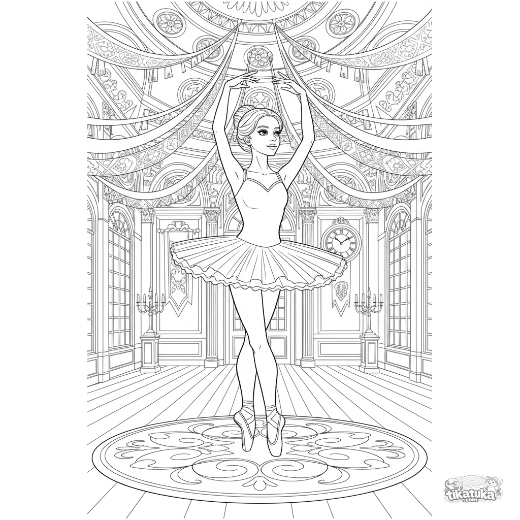 Ausmalbild für ältere Kinder 10-12: Eine Ballerina, die eine Pirouette in einer dekorierten Festhalle tanzt. Detaillierte Zeichnung mit Girlanden.