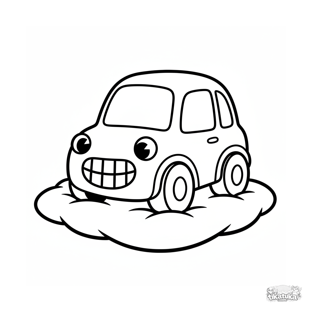Auto-Ausmalbild für 2-3 Jahre: ein einfaches freundliches Auto auf einem Kissen. Große Details, klare Radumrisse.