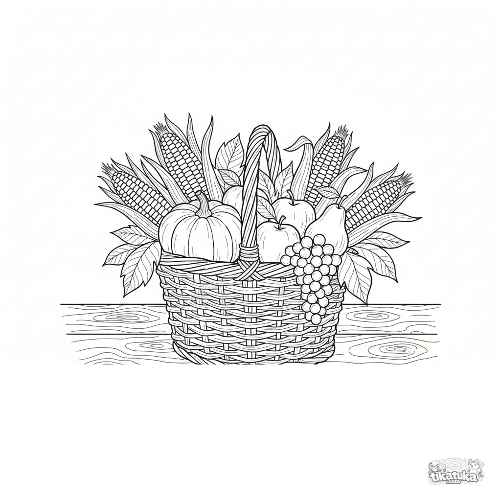 Detailliertes Ausmalbild für 10-12 Jahre: Ein Korb voller Herbsternte. Realistischer Aquarell-Skizzen-Stil, gemütliches Stillleben auf einem Holztisch.