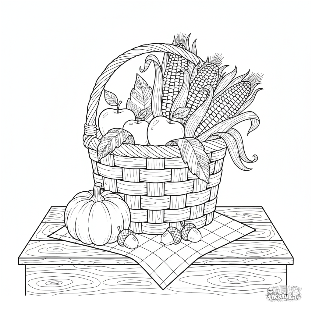 Detailliertes Ausmalbild: Ein Korb mit Herbsternte aus Kürbis, Äpfeln und Mais. Für ältere Kinder von 10-12 Jahren.