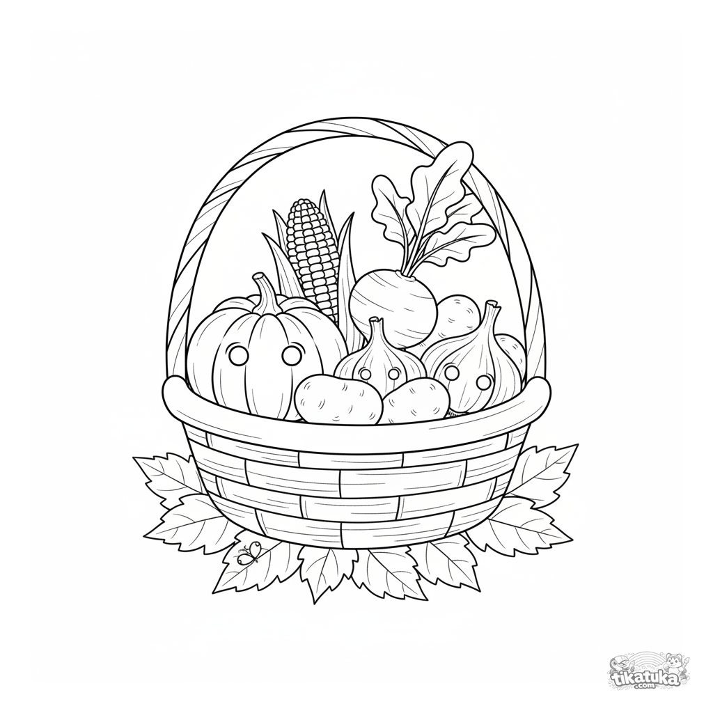 Komplexes Ausmalbild für 10-12 Jährige: ein rustikaler geflochtener Korb voller Herbstgemüse. Detailliertes Stillleben im lockeren Aquarell-Skizzen-Stil.