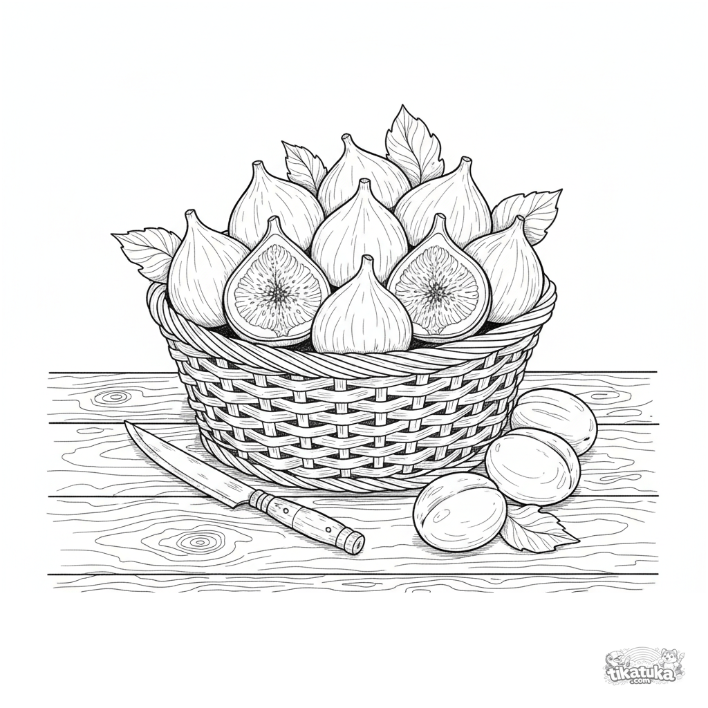 Ausmalbild für ältere Kinder 10-12: ein detailliertes Stillleben eines Korbes voller Feigen und Pflaumen. Aquarell-Skizzen-Stil, Holz- und Fruchttexturen.