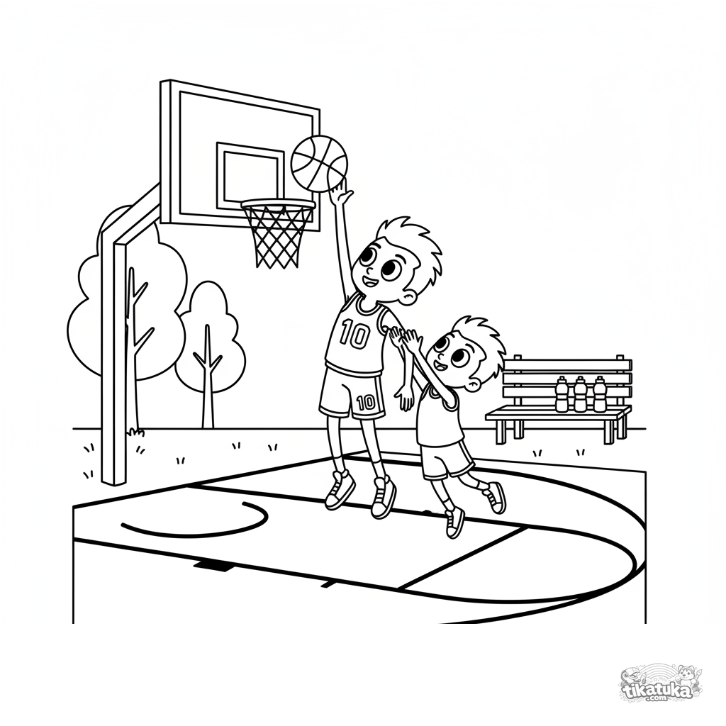 Ausmalbild für Kinder: Ein Basketballspieler führt einen Korbleger auf einem Außenplatz aus. Für 4-6 Jahre, eine dynamische Szene mit Sportaktion.