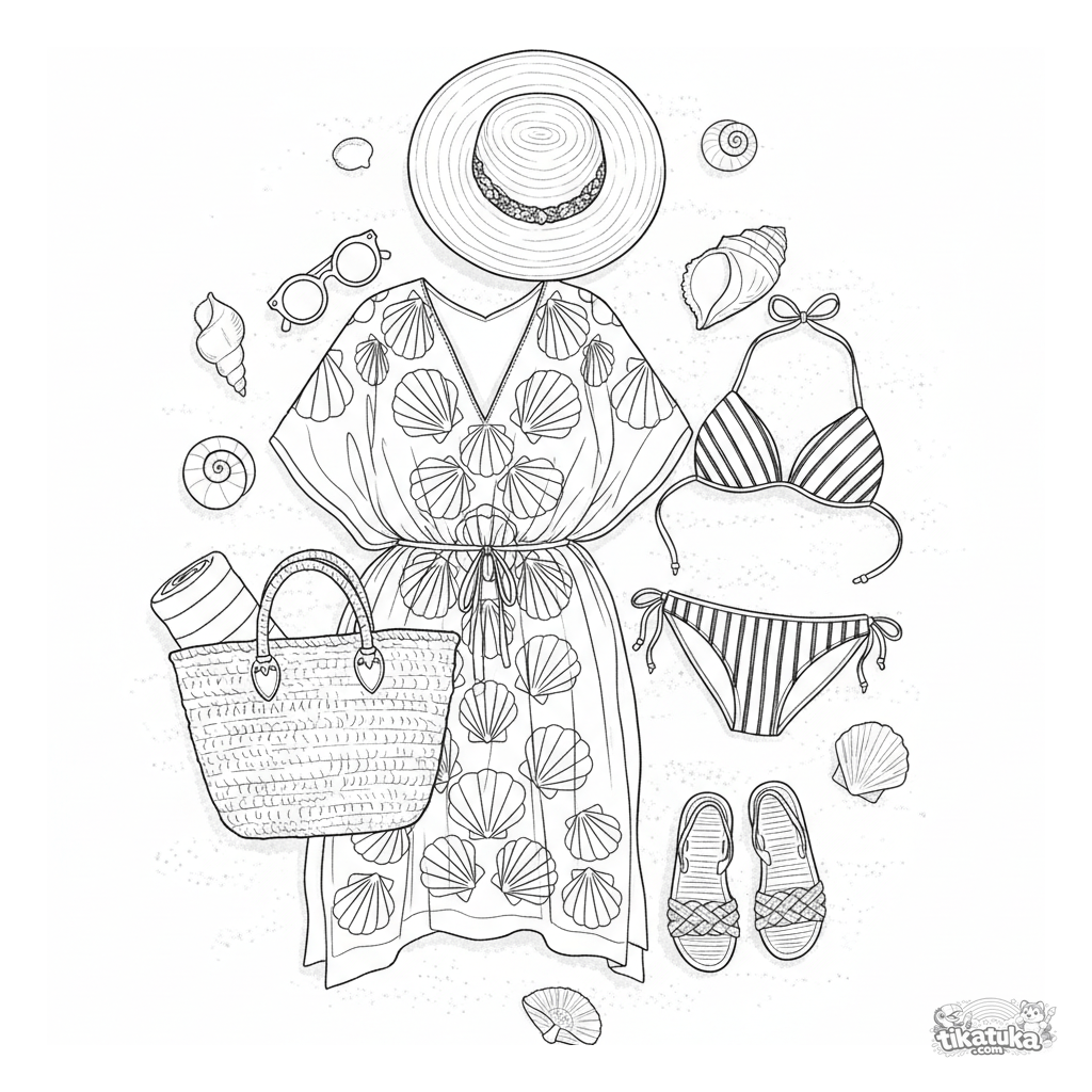 Detailliertes Ausmalbild für 10-12 Jahre: Strand-Outfit-Flachlage auf Sand mit Kaftan, Bikini, Hut und Accessoires. Sommerthema mit vielen Texturen und Mustern.