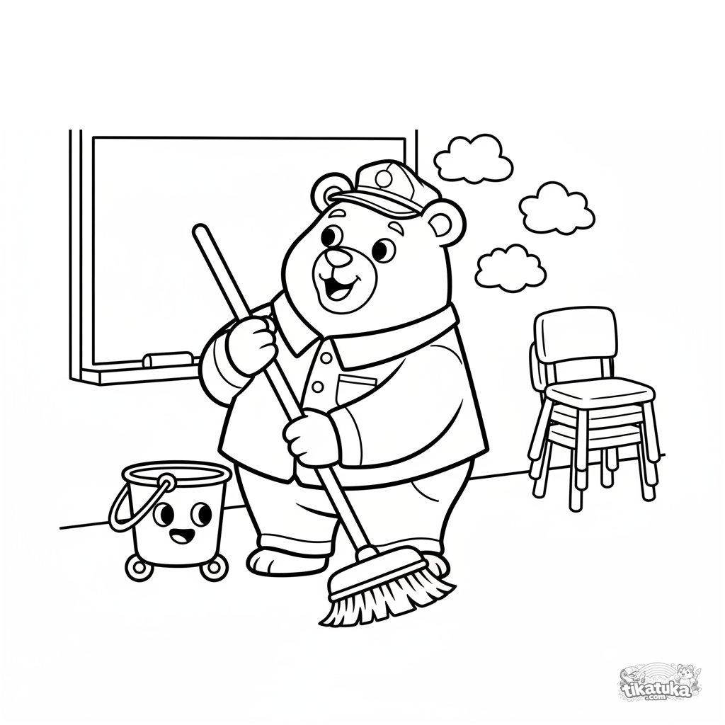 Ausmalbild für Kleinkinder 2-3: Ein sanfter Bär-Hausmeister fegt fröhlich den Boden im Klassenzimmer an der Tafel, mit Besen und Mopp-Eimer.
