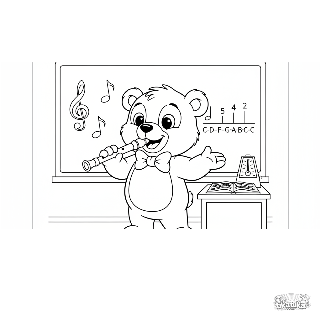 Ausmalbild für Kinder 7-9: ein fröhlicher Bär-Musiklehrer mit einer Blockflöte an einer Tafel mit Noten. Klassischer Cartoon-Stil.