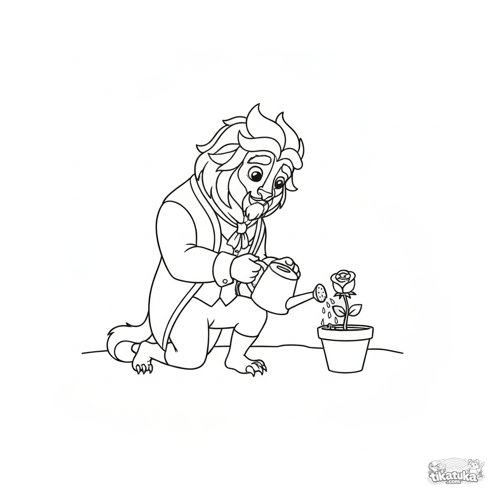 Ausmalbild für Kinder. Das Biest gießt liebevoll eine verzauberte Rose in seinem Schloss. Einfache Linien für Kleinkinder. Kostenlos herunterladen.