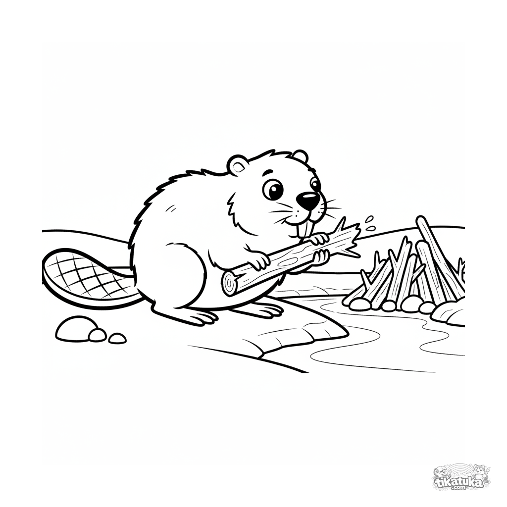 Einfaches Ausmalbild für Kleinkinder 2-3: Ein Biber läuft das Bachufer entlang und trägt einen großen Ast. Große, klare Formen im Volksstil, wenige Linien.