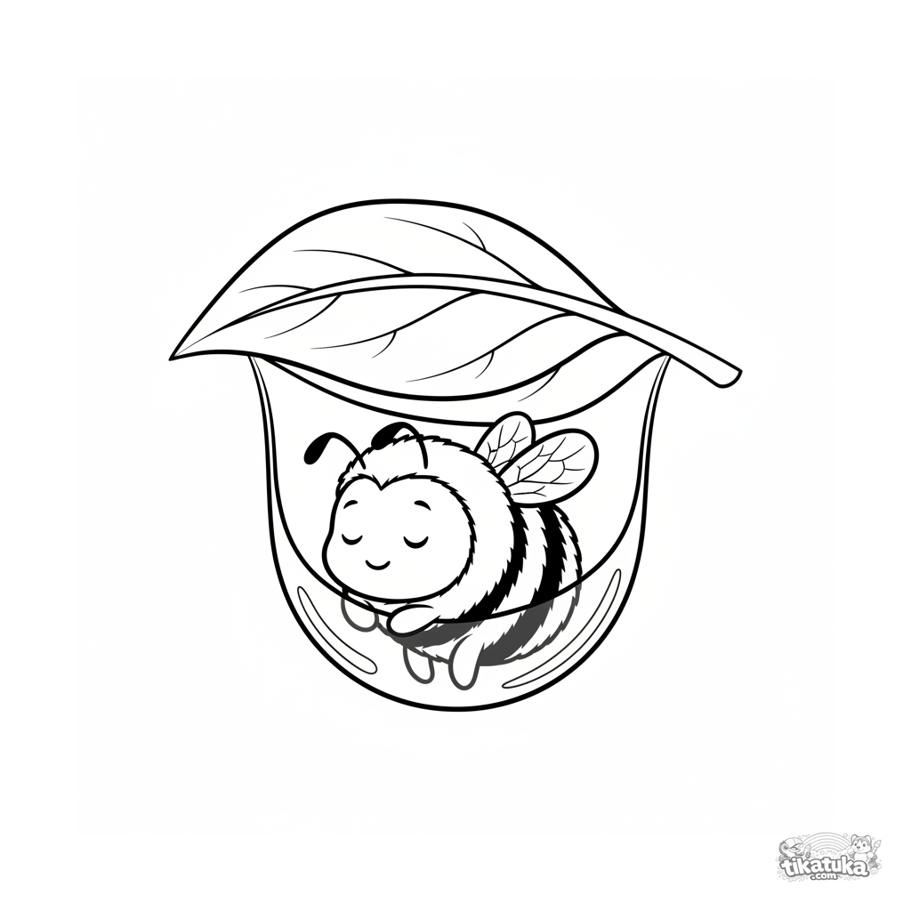 Ausmalbild für Kleinkinder 2-3 Jahre: Eine dicke Biene schläft in einer Tautropfen-Hängematte auf einem großen Blatt.