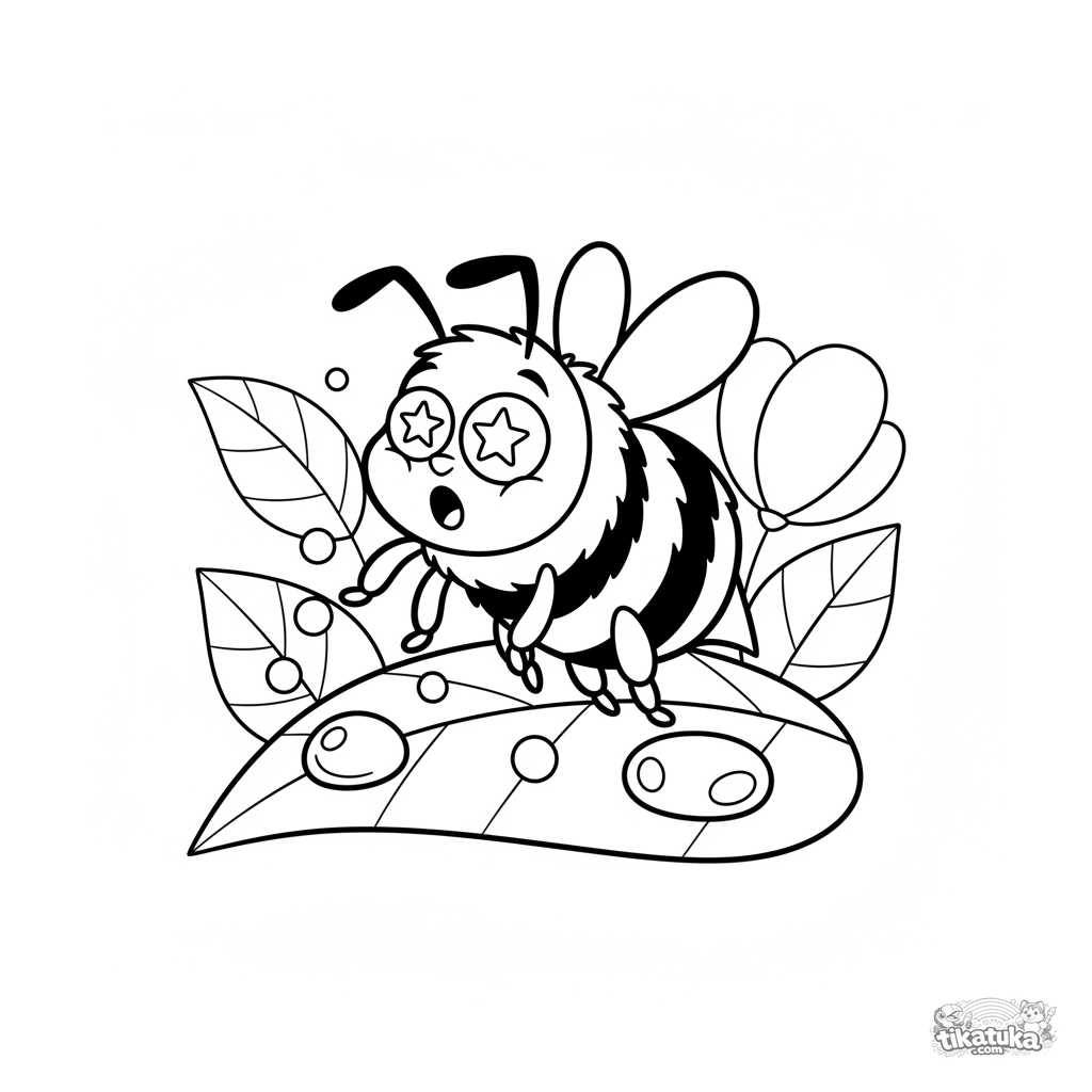 Ausmalbild für Tweens 7-9: Eine pelzige Hummel rutscht auf einem großen Tautropfen auf einem Blatt aus. Lustige Pose im 90s-Nickelodeon-Stil, ausdrucksstarke Emotionen, mäßige Details.