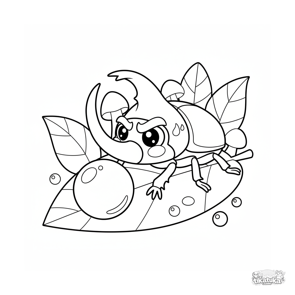 Ausmalbild für Kinder 4-6: Ein kräftiger Nashornkäfer rollt einen großen Tautropfen über ein Blatt. Dynamische Comic-Abenteuer-Umrisse, ausdrucksstarke Pose, ausgewogene Details.