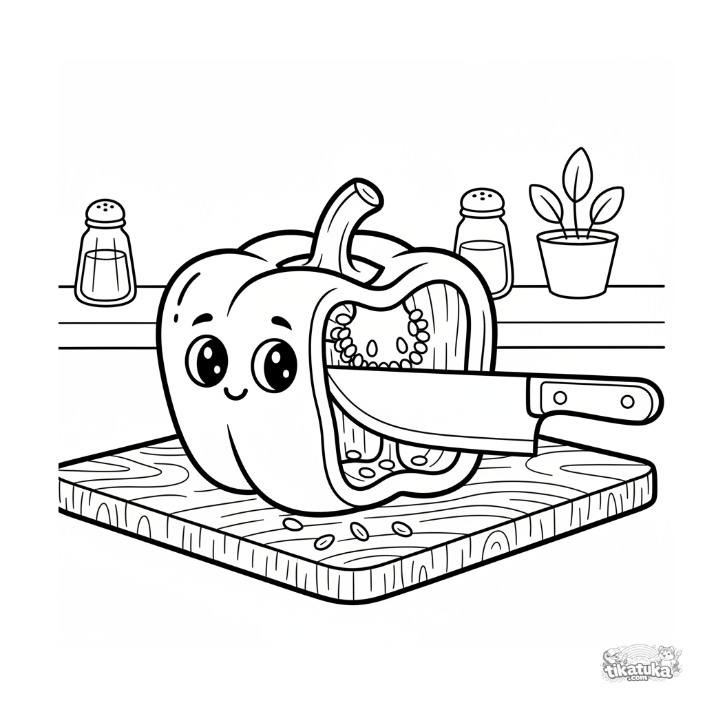 Ausmalbild für Tweens 7-9: eine Paprika, auf einem Holzschneidebrett halbiert, zeigt innere Rippen und Samen. Sauberer Flat-Vector-Stil.