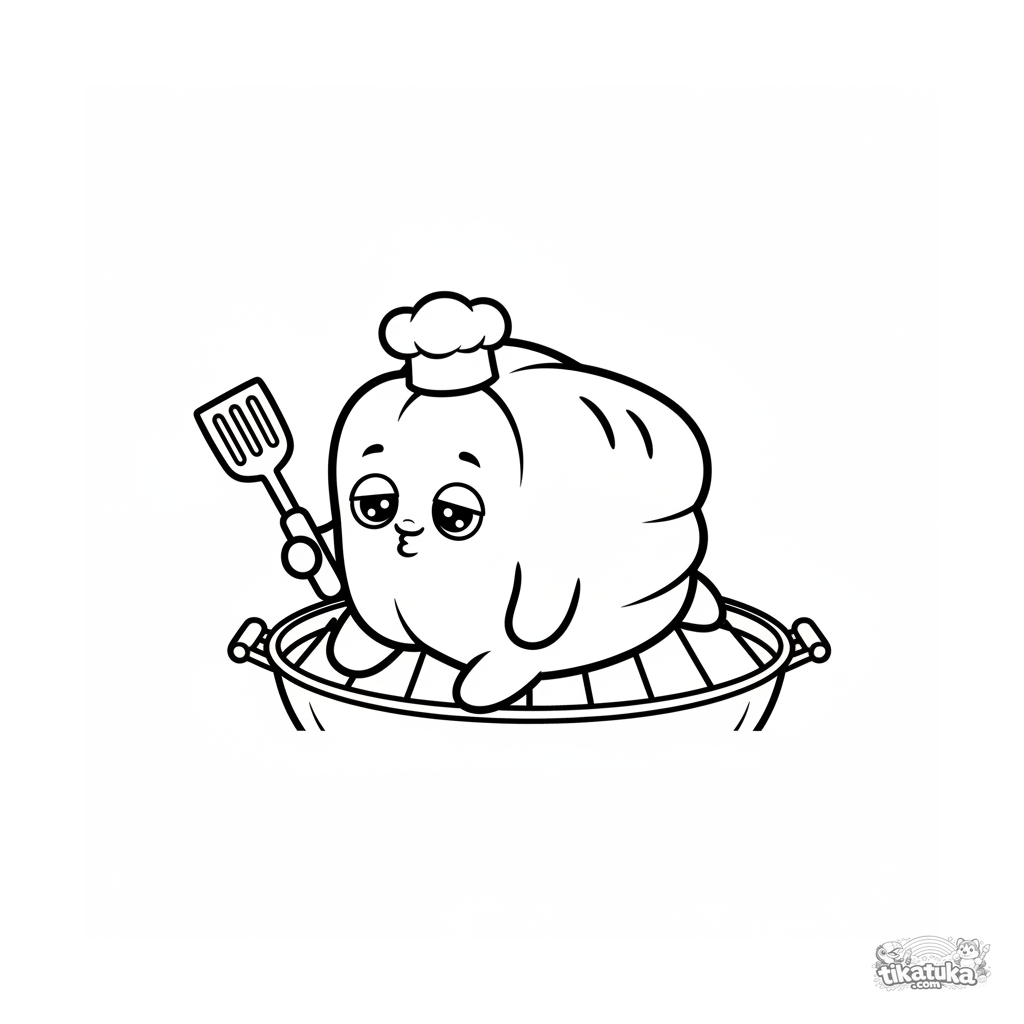 Einfaches Ausmalbild für Kleinkinder 2-3: ein fröhlicher Paprika-Koch liegt auf einem Grill. Große Formen, dicke Umrisse, perfekt für erste Buntstifte.