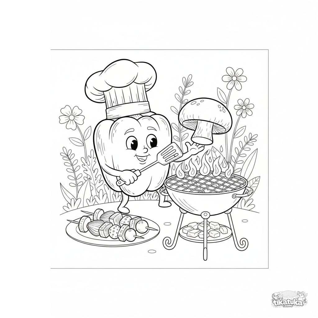 Detailliertes Ausmalbild für 10-12 Jahre: Ein Paprika-Koch kocht auf einem Gartengrill. Realistischer Feld-Guide-Stil.