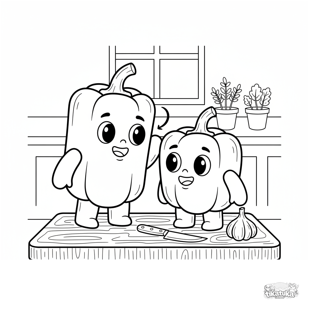 Ausmalbild von zwei Paprikas auf einem Schneidebrett. Für Kinder 4-6. Paprikas interagieren, mit Messer und Knoblauch daneben.