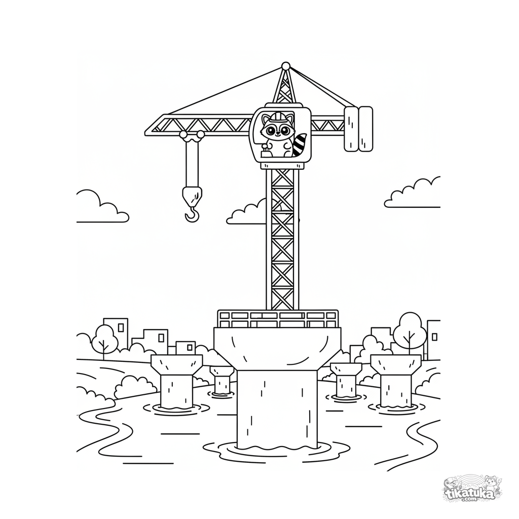 Ausmalbild für Tweens 7-9: Ein großer Baukran arbeitet an einem neuen Brückenpfeiler in der Mitte eines Flusses. Ein Waschbärenfahrer in der Kabine beobachtet aufmerksam. Mittlere Detailstufe.
