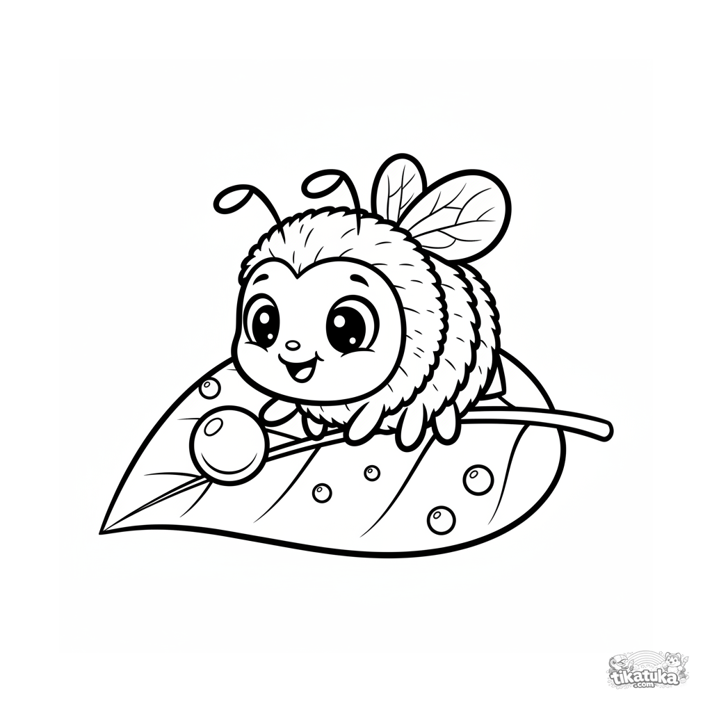 Ganz einfaches Ausmalbild für Kleinkinder 2-3: eine flauschige Hummel mit großen Augen sitzt auf einem Blatt und berührt einen Tautropfen.
