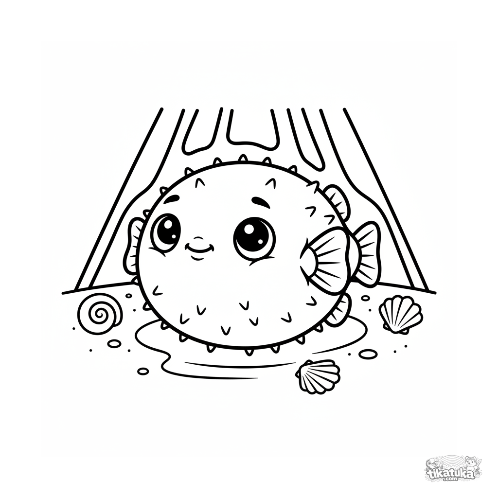 Einfaches Ausmalbild für Kleinkinder: Ein runder Kugelfisch ruht auf dem Sandboden in Sonnenstrahlen. Für 2-3 Jahre. Große Formen, weite Ränder.