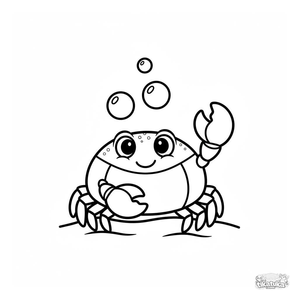 Ausmalbild für Kleinkinder 2-3: Eine große, freundliche Krabbe sitzt auf dem Sand im Flachwasser. Sehr einfache Formen, dicke Umrisse.