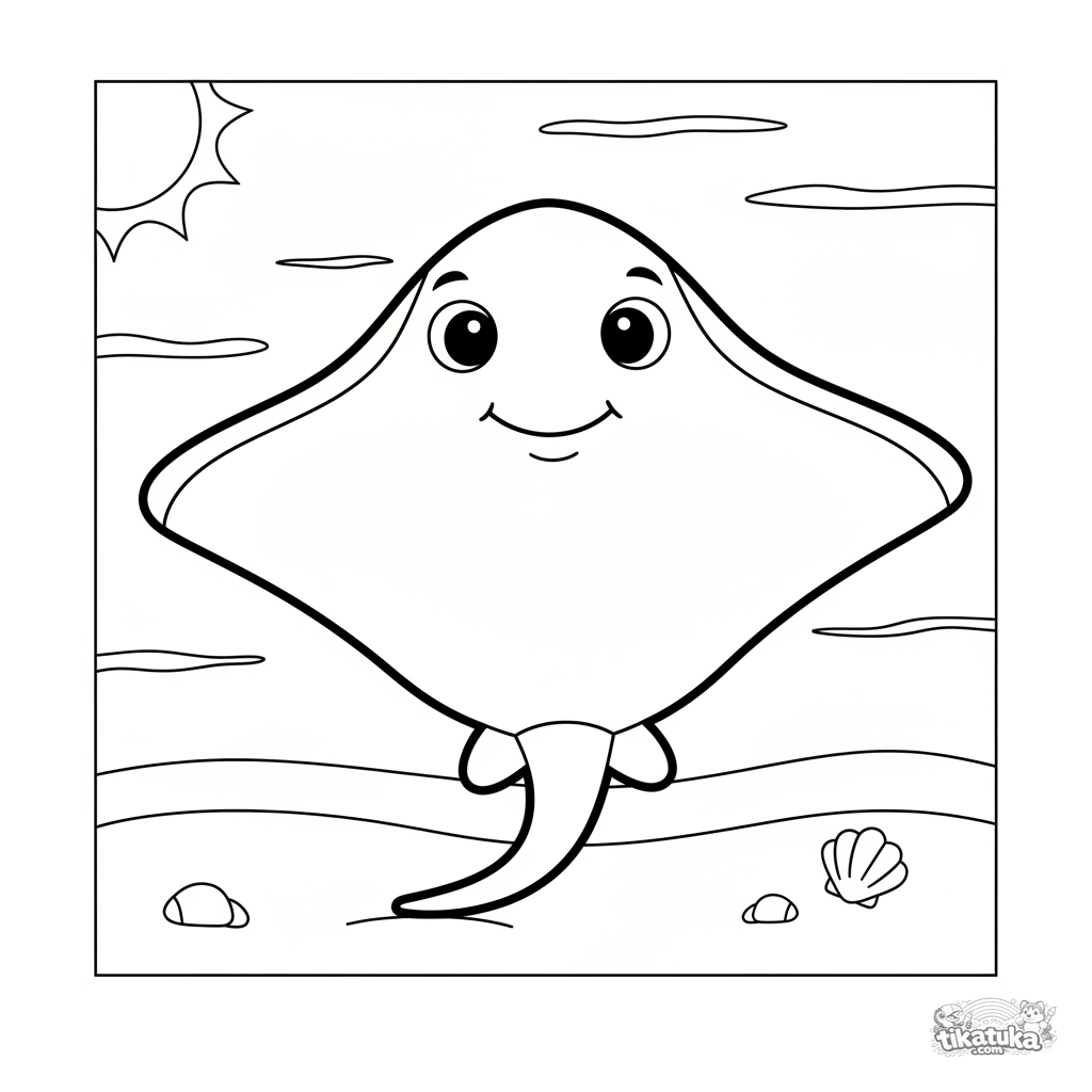 Einfaches Ausmalbild eines großen freundlichen Stechrochens, der auf sonnigem Sand ruht. Für Kleinkinder 2-3 Jahre, riesige einfache Formen.