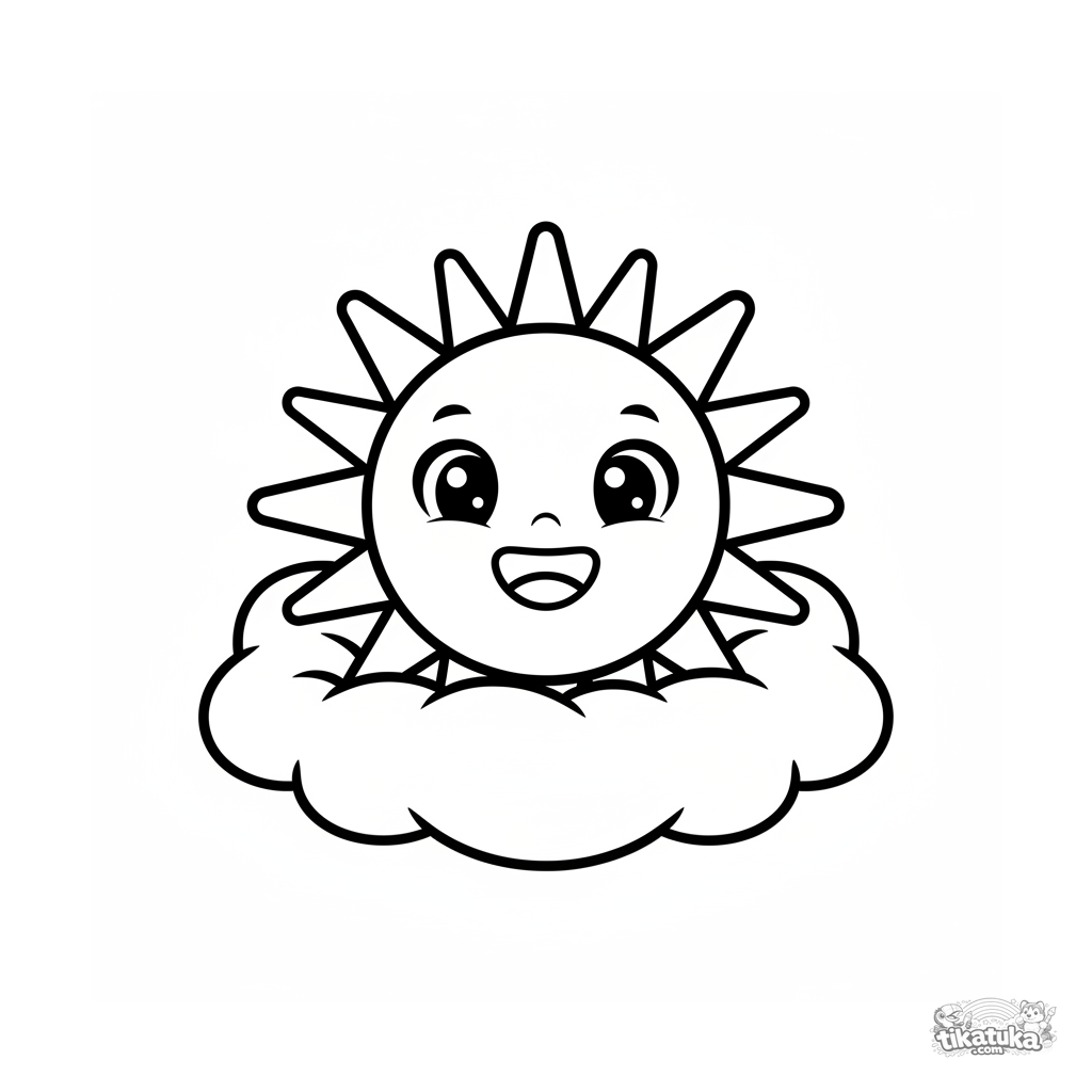 Helles Ausmalbild für Kleinkinder: eine große lächelnde Sonne mit Strahlen sitzt auf einem wolkenförmigen Kissen. Sehr einfache und klare Formen.