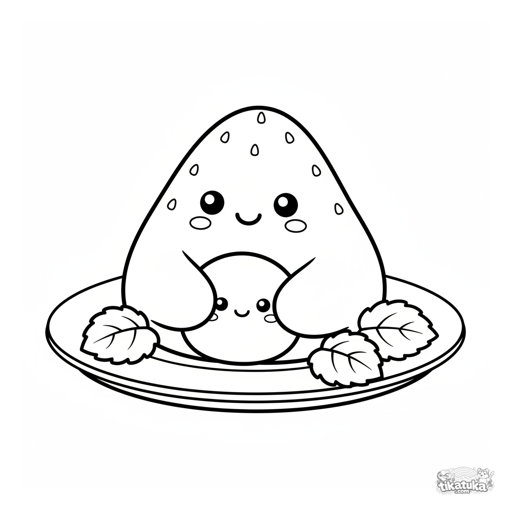 Einfaches Ausmalbild für Kleinkinder 2-3: Ein großer Erdbeer-Mochi hält einen kleinen Freund. Große klare Formen, breite Ränder.