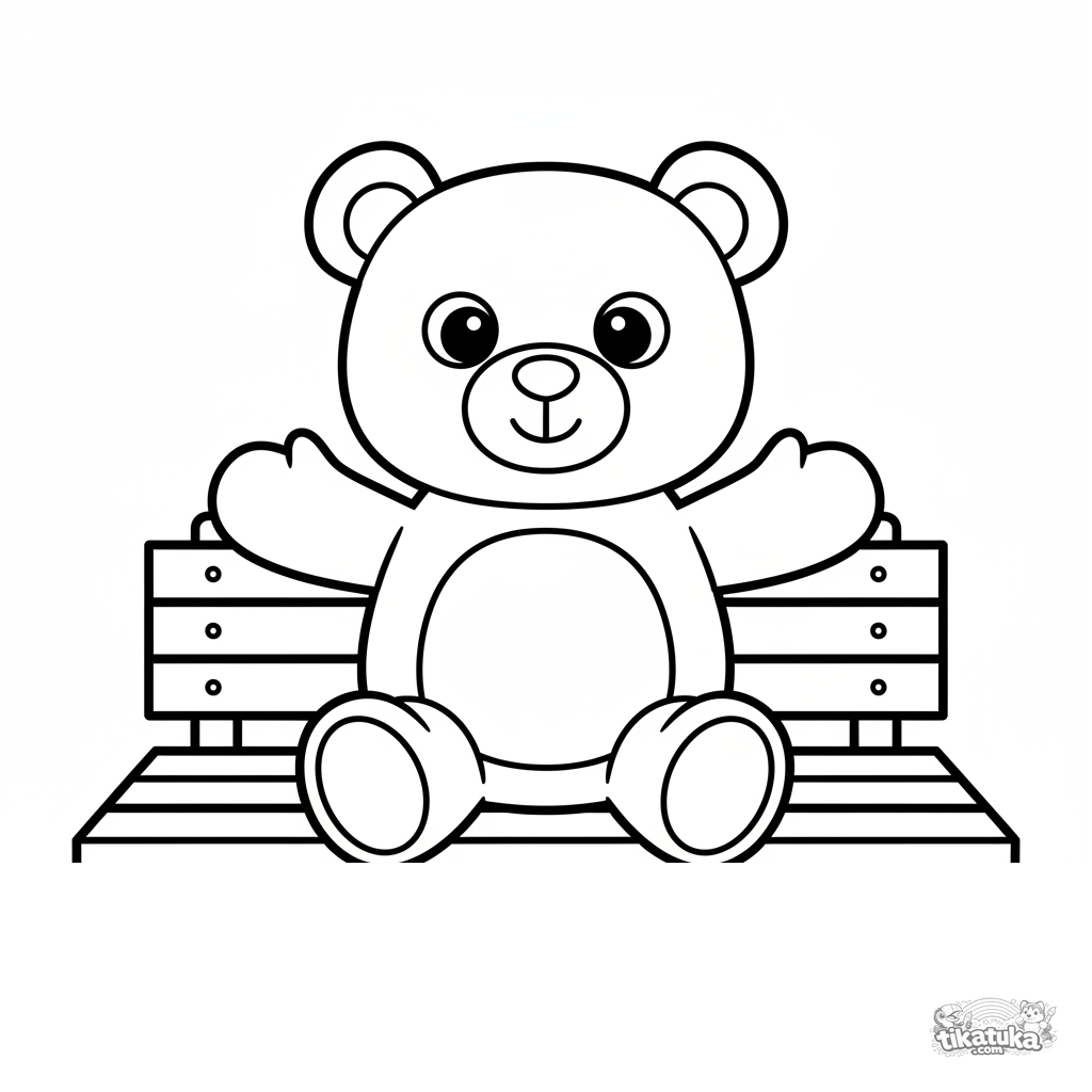 Ganz einfaches Ausmalbild für Kleinkinder 2-3: Ein großer Plüschteddy sitzt auf einer Parkbank. Große Formen, viel Freiraum zum Ausmalen.