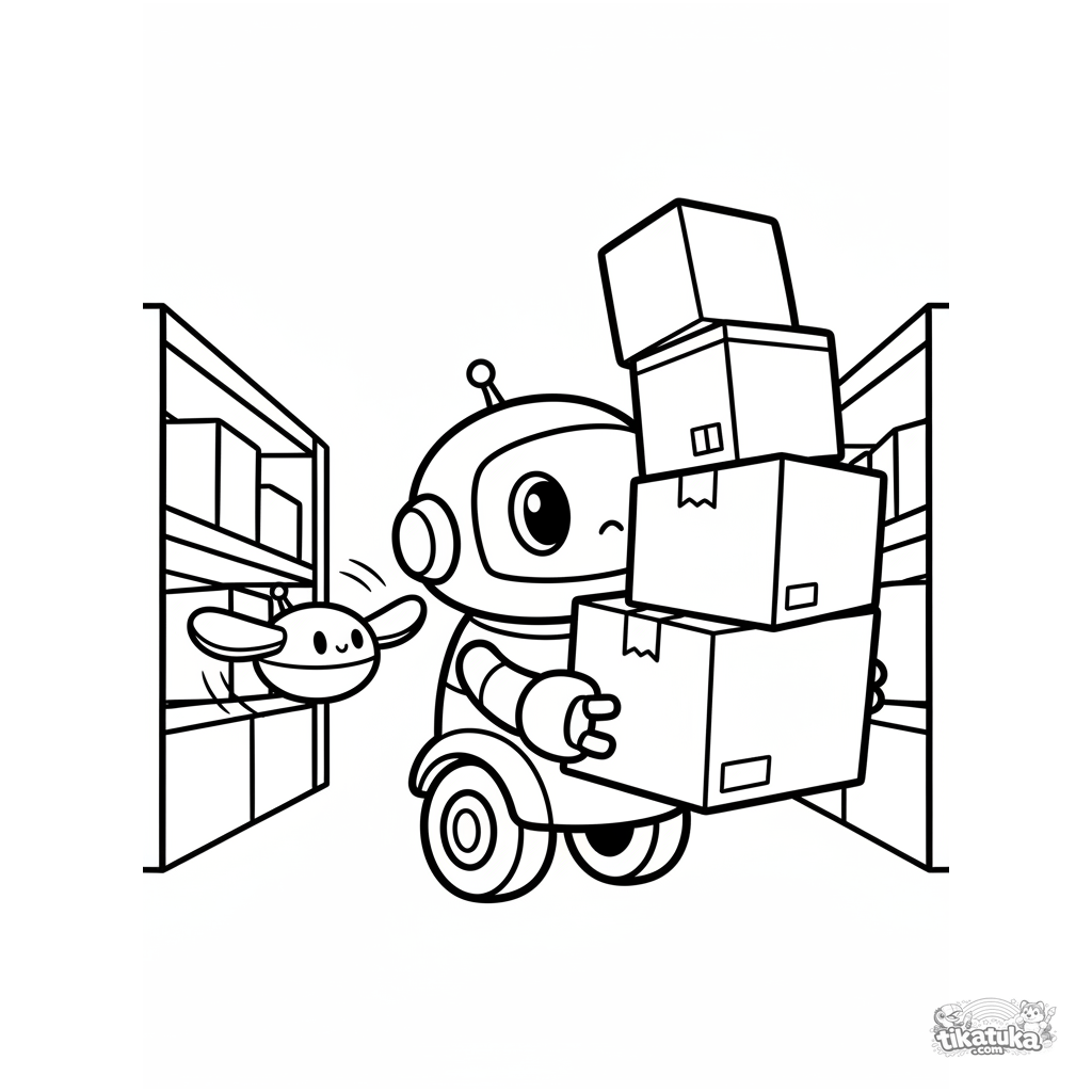 Einfaches Ausmalbild für Kleinkinder 2-3: Ein fröhlicher runder Roboter auf einem großen Rad trägt vorsichtig einen hohen Stapel Kartons durch ein Lagerhaus, eine Drohne saust vorbei.