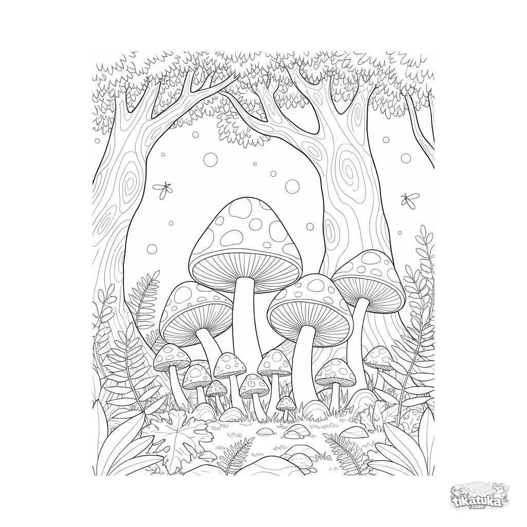 Magisches Ausmalbild von biolumineszierenden Pilzen und Glühwürmchen auf einer Waldlichtung. Für Kinder von 6-9 Jahren. Zeigt fantastische Pilze, Glühwürmchen, einen alten Baum und Farne.
