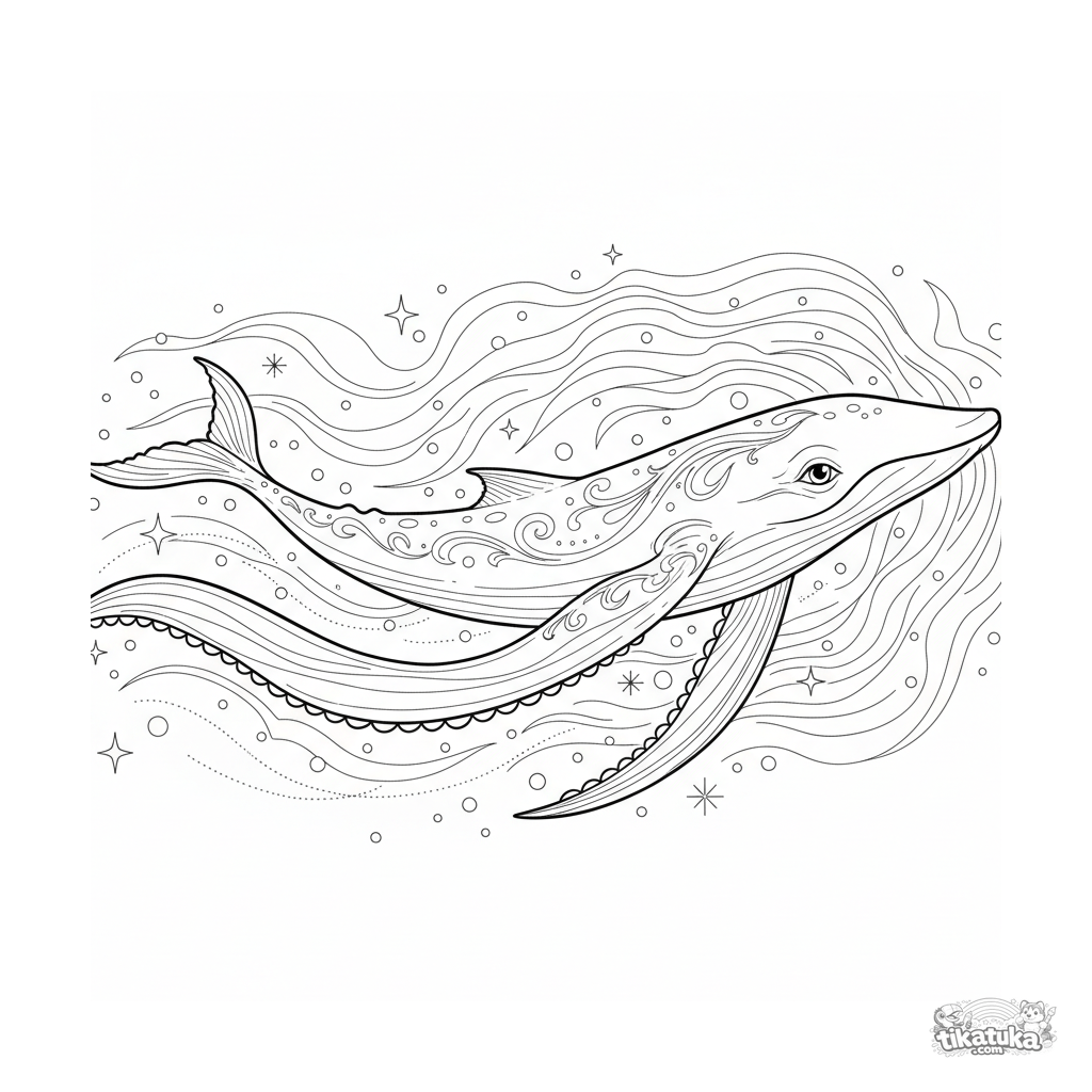 Ausmalbild für ältere Kinder 10-12: Ein fantastischer leuchtender Weltraumwal schwimmt durch einen Nebel.
