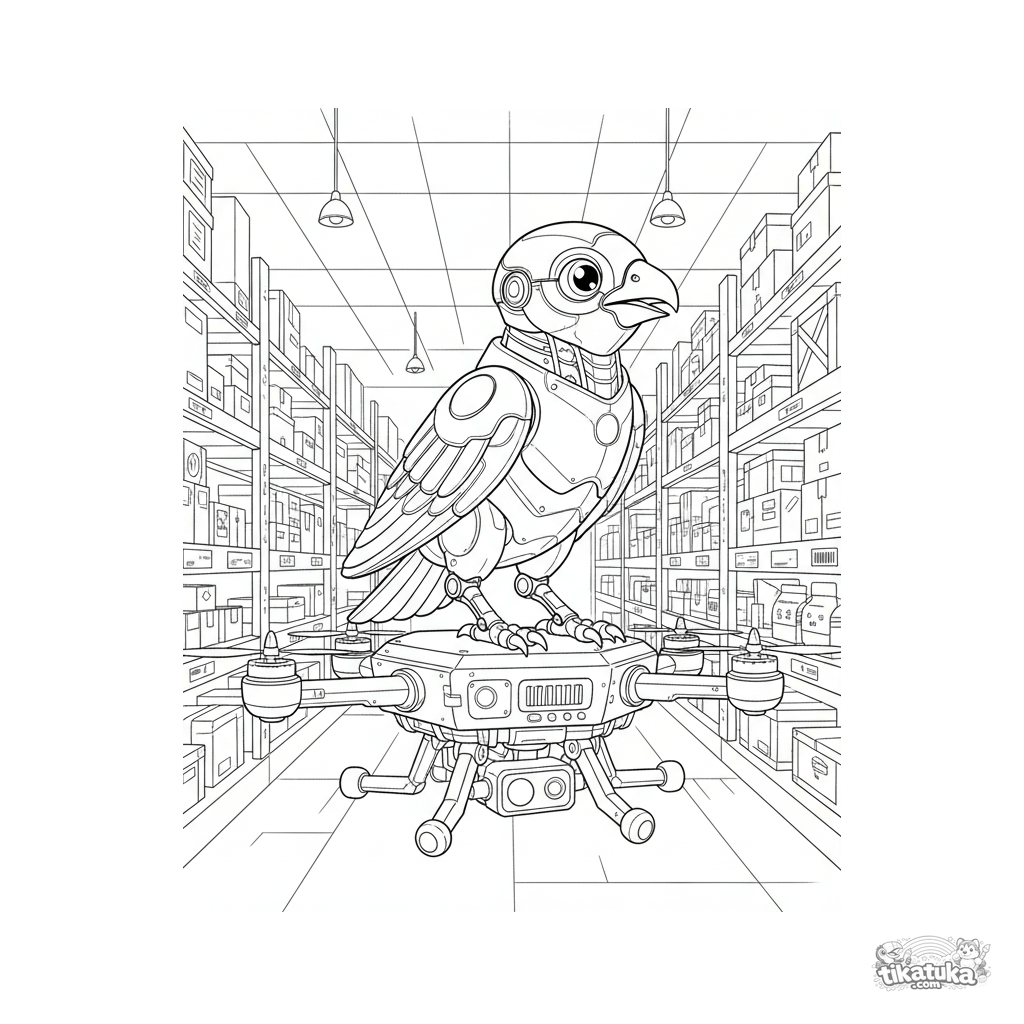 Ausmalbild für ältere Kinder 10-12: Ein realistischer vogel-förmiger Roboter sitzt auf einer fliegenden Scanner-Drohne und beobachtet ein Lagerhaus. Detaillierte mechanische Formen.