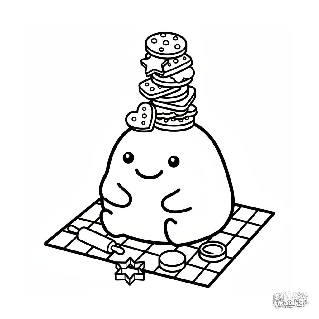 Ganz einfaches Ausmalbild für Kleinkinder 2-3: Ein Klecks-Monster balanciert einen Keksturm beim Picknick. Große, klare Umrisse.