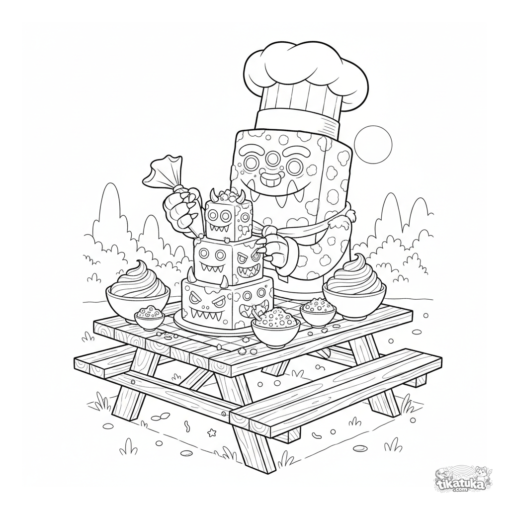 Detailliertes Ausmalbild für Kinder 10-12: Ein eckiges Monster mit Kochmütze verziert einen festlichen Kuchen auf einem Picknick.