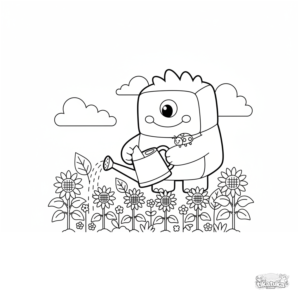 Ausmalbild für Kinder 4-6: Ein eckiges Monster mit einem Auge gießt Sonnenblumen im Garten.
