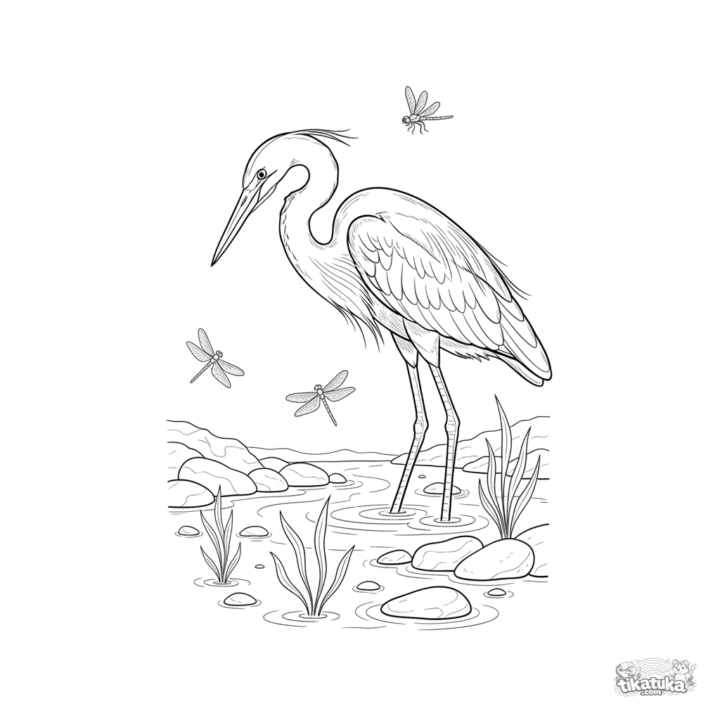 Komplexes Ausmalbild für 10-12 Jahre: Ein realistischer Reiher wartet im klaren Bach auf Beute. Detaillierte Darstellung von Federn, Steinen und Wasserpflanzen.