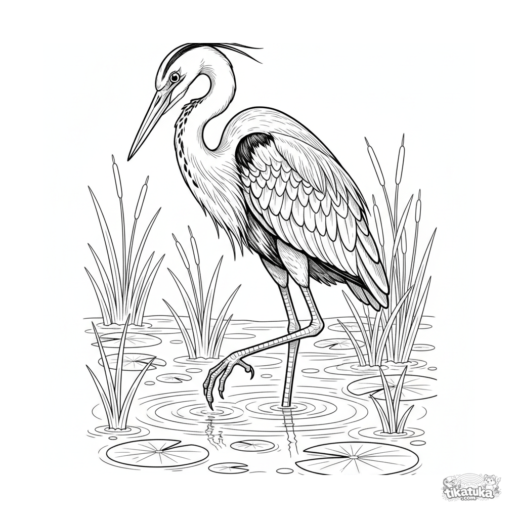 Detailliertes Ausmalbild für Kinder 10-12: Ein eleganter Reiher steht in einem klaren Bach und beobachtet seine Beute. Realistische Illustration mit Schilf und Seerosenblättern.