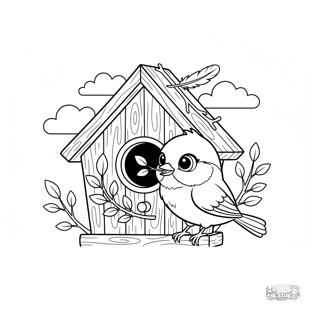 Ausmalbild für Kinder von 4-6 Jahren: eine fröhliche Blaumeise schmückt den Eingang eines Holz-Vogelhauses mit einem Zweig. Helle, klare Szene mit ausgewogenen Details.