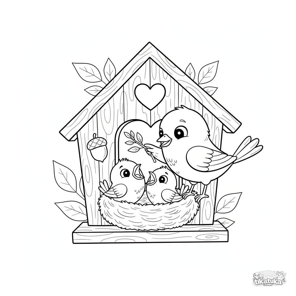 Ausmalbild für Kinder 4-6: Eine Blaumeisen-Familie im gemütlichen Holz-Vogelhaus mit Nest. Ein Elternteil bringt einen Zweig, während die Küken auf Futter warten.
