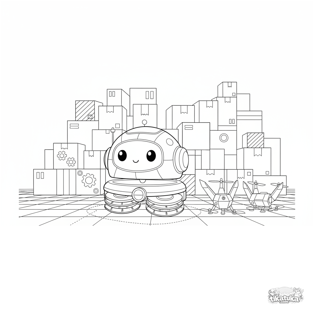 Stilvolles Ausmalbild für ältere Kinder 10-12: Ein Reinigungsroboter im Blaupausen-Stil räumt den Lagerboden zwischen Kartons und Drohnen auf. Geometrische Linien, einzigartiges Design.