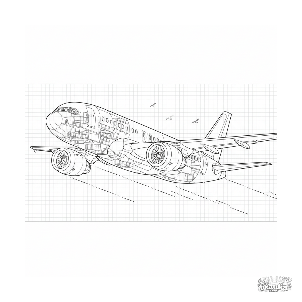 Stylisiertes Ausmalbild in Form einer technischen Blaupause eines modernen Verkehrsflugzeugs im Flug. Detaillierte Zeichnung für Kinder von 10-12 Jahren, die sich für Luftfahrt interessieren.