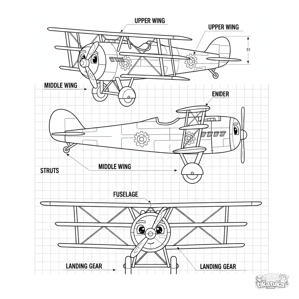 Pädagogisches Ausmalbild im Stil einer Ingenieur-Blaupause für einen WWI-Dreidecker. Stilisiertes Diagramm für Kinder von 10-12 Jahren.