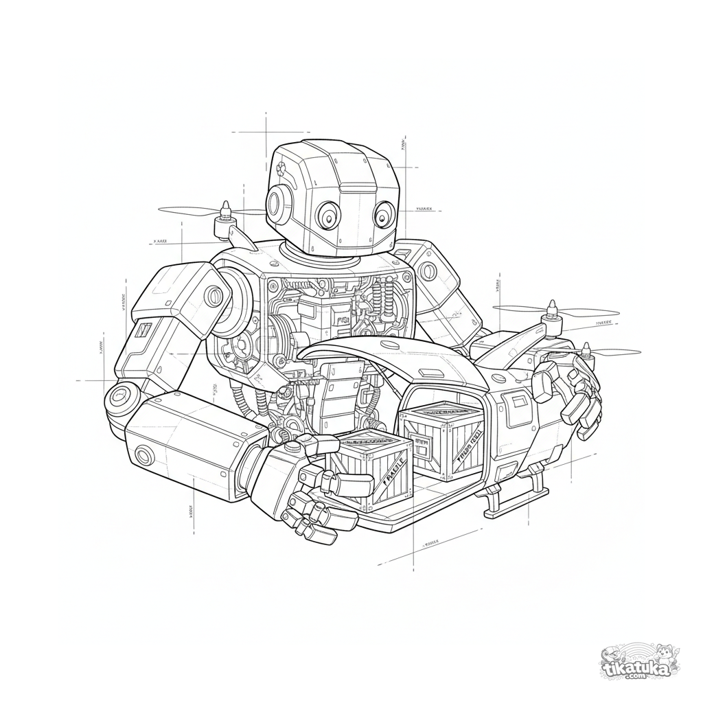 Komplexes Ausmalbild für 10-12 Jahre: Ein Roboter mit transparentem Körper, wie eine technische Blaupause, entlädt Kisten aus dem Frachtraum einer großen fliegenden Transportdrohne in einer Lagerhalle.
