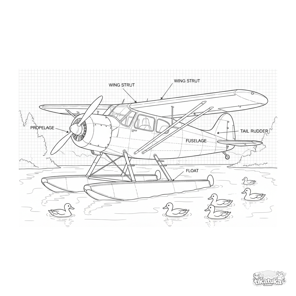 Komplexes Ausmalbild für 10-12 Jahre: Ein Wasserflugzeug im Blaupausen-Stil auf einem See. Detaillierte Linien, schematische Elemente.
