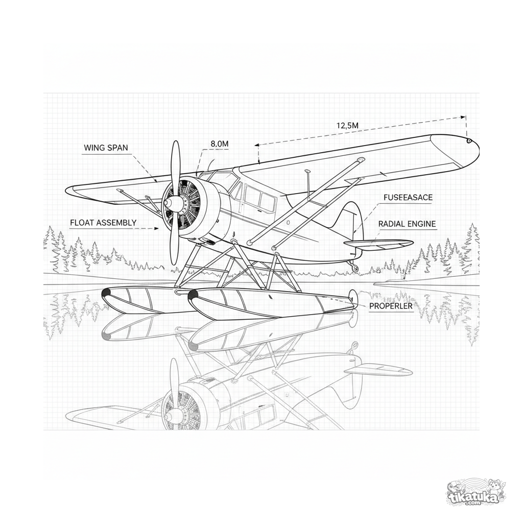 Blaupausen-Ausmalbild eines Wasserflugzeugs aus der Mitte des Jahrhunderts auf einem See. Für 10-12 Jahre. Detaillierte Linien, Schwimmer und Wasserspiegelung.
